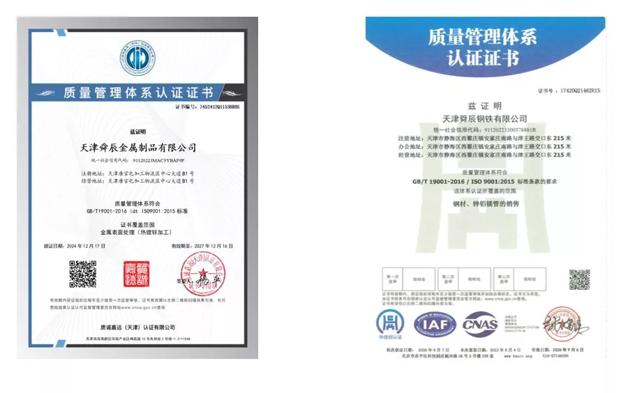 Hvorfor velge oss? Tianjin Shuncheng Industry kan skryte av årevis med akkumulert produksjonsteknologi, som opprettholder en 12-årig rekord med null mislighold og null årlige kvalitetshendelser, og legger et solid grunnlag for produktkvalitet. Selskapet følger strengt nasjonale produksjonsstandarder og har ISO 9000, 3A-systemsertifiseringer og EU CE-sertifisering. Med en 12-trinns prosess og en 3-lags full inspeksjonsmekanisme, oppnår den null kvalitets- og sikkerhetshendelser årlig og null ordre standard i 12 år, noe som viser sin beviste styrke. Hvert ferdig produkt gjennomgår tørking, inspeksjon og finbehandling før pakking og forsendelse, noe som sikrer overlegen kvalitet. Selskapet sysselsetter over 300 produksjonsarbeidere og kan produsere 236 spesifikasjoner av ERW stålrør, og tilbyr et komplett utvalg av spesifikasjoner og støtter tilpasning for nøyaktig å møte ulike behov.