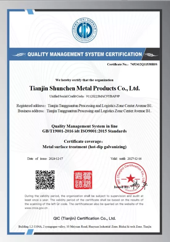 Shunchen Industrials Steel U-seksjon har oppnådd ISO9001 kvalitetssertifisering, som oppfyller nasjonale standarder. Vi tilbyr tredjeparts materialtestingsrapporter og sertifikater for galvaniseringstykkelse. Vår produksjon benytter avanserte produksjonslinjer, som gjennomgår 12 strenge prosesstrinn, styrket av over 20 års produksjonsekspertise. Vi har opprettholdt en 12-årig merittliste med null kontraktsbrudd og null årlige kvalitetshendelser. Under produksjonsprosessen påføres tre passiveringsbehandlinger for å forbedre anti-alkalibestandigheten til galvaniserte produkter. Hvert ferdig produkt gjennomgår tørking, inspeksjon og etterbehandling før det pakkes og sendes. Selskapet har ISO 9000, 3A-systemsertifiseringer og EU CE-sertifisering. Med våre 12 prosesstrinn og en tre-lags omfattende inspeksjonsmekanisme, har vi oppnådd null årlige kvalitets- og sikkerhetshendelser og opprettholdt en 12-års rekord med null kontraktsbrudd.