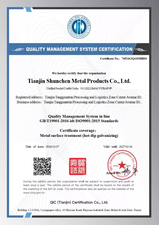 Velg Shunchen for pålitelig kvalitet. Vi bruker høykvalitets stål av Q235B eller Q355B, behandlet gjennom varmgalvanisering for korrosjonsbestandighet. Temperaturen på sinkpotten er nøyaktig kontrollert innenfor området 450-460 grader Celsius for å sikre sterk adhesjon av sinkbelegget og ingen ubesvarte områder. Våre produkter er i samsvar med ISO9001-kvalitetssystemsertifisering og er støttet av tredjeparts inspeksjonsrapporter for sinkbelegg.